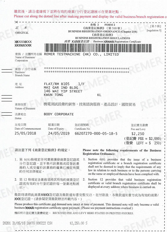 REMER TESTMACHINE (HK) CO., LIMITED 商业登记证