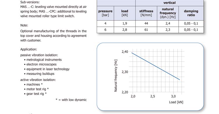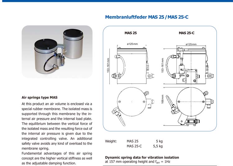 这个产品的封闭风量是通过特殊的橡胶膜封闭。孤立的质量是通过模内的空气和内部载荷板支撑,分离质量的垂直力和产生的力分离质量内部的空气压力是由于集成控制阀之间的平衡。一个额外的安全阀,避免对膜片弹簧过载。