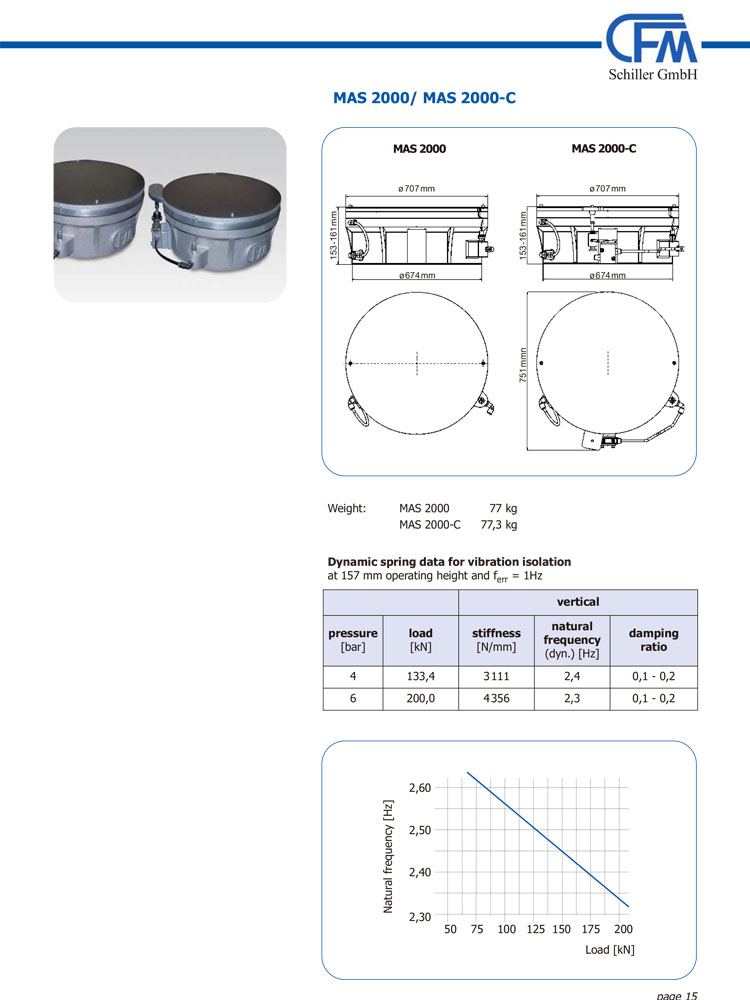 此产品具有特制橡胶薄膜封闭的气室。通过薄膜内部的气压和内部的负载板来支撑所需隔离的设备。被隔离的设备垂直力和内部气压对外部合力的水平平衡由集成的水平控制阀自动调节。附加的安全阀避免了膜式空气弹簧的各种超载现象 。