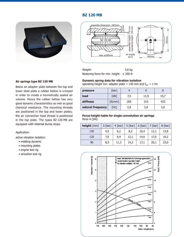 下面的适配器板之间的顶部和下钢板橡胶波纹管是波纹为了创造一个密封的空气体积。因此,橡胶波纹管具有很良好的动态特性以及良好的耐化学性。安装螺纹定位在顶部和下部板;空气连接软管螺纹在顶板。BZ 120 MB的类型配备内部凸点停止。