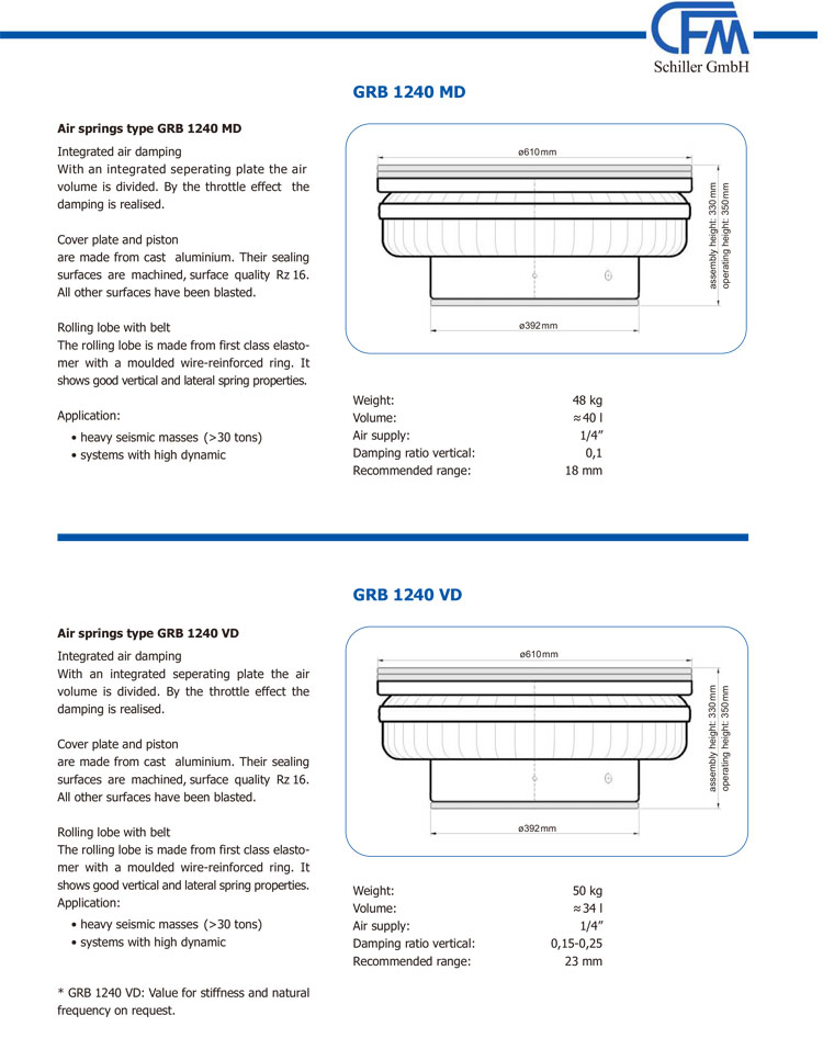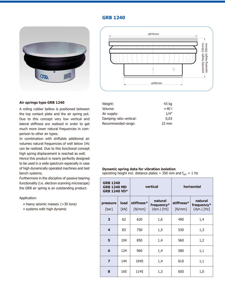 环形橡胶曲面位于顶部锥板和空气弹簧活塞之间。基于此原理,垂直和横向的较低刚度保证了比其他空气弹簧型号更低的固有频率。结合可移动的附加空气容器 ,可实现低于1赫兹的固有频率。这种功能原理也实现了高度弹性位移。因此,特别是应用于高动态力设备和试验台系统的大范围振动频率,这种型号的设计几乎是完美的解决方案。另外,在被动隔振功能方面(如电子扫描显微镜),GRB空气弹簧同样效果显著。