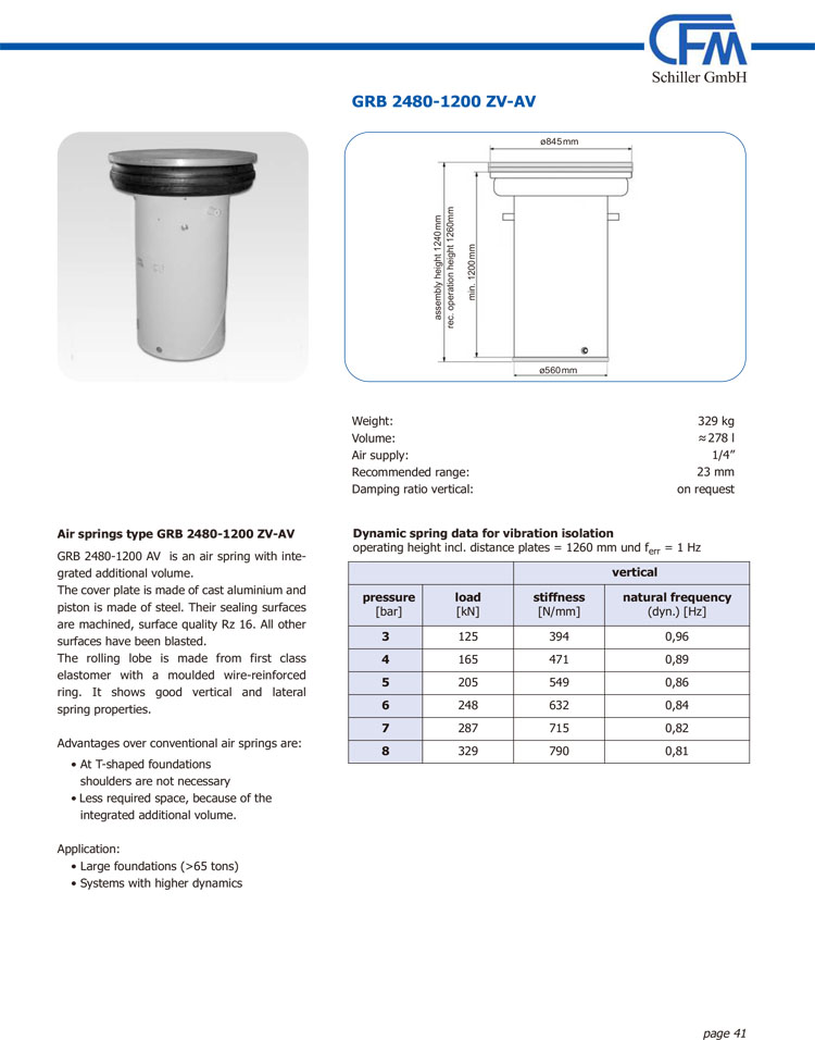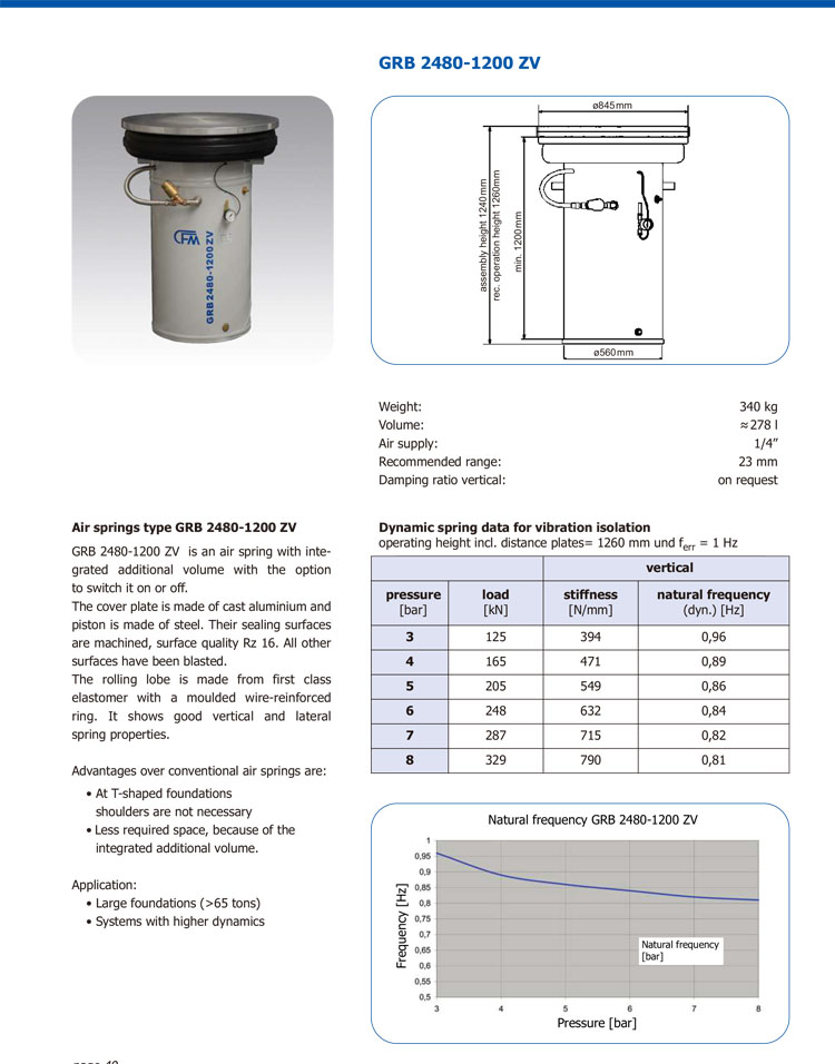 空气弹簧型号GRB 环形橡胶曲面位于顶部锥板和空气弹簧活塞之间。基于此原理,垂直和横向的较低刚度保证了比其他空气弹簧型号更低的固有频率。结合可移动的附加空气容器 ,可实现低于1赫兹的固有频率。这种功能原理也实现了高度弹性位移。因此,特别是应用于高动态力设备和试验台系统的大范围振动频率,这种型号的设计几乎是完美的解决方案。另外,在被动隔振功能方面(如电子扫描显微镜)