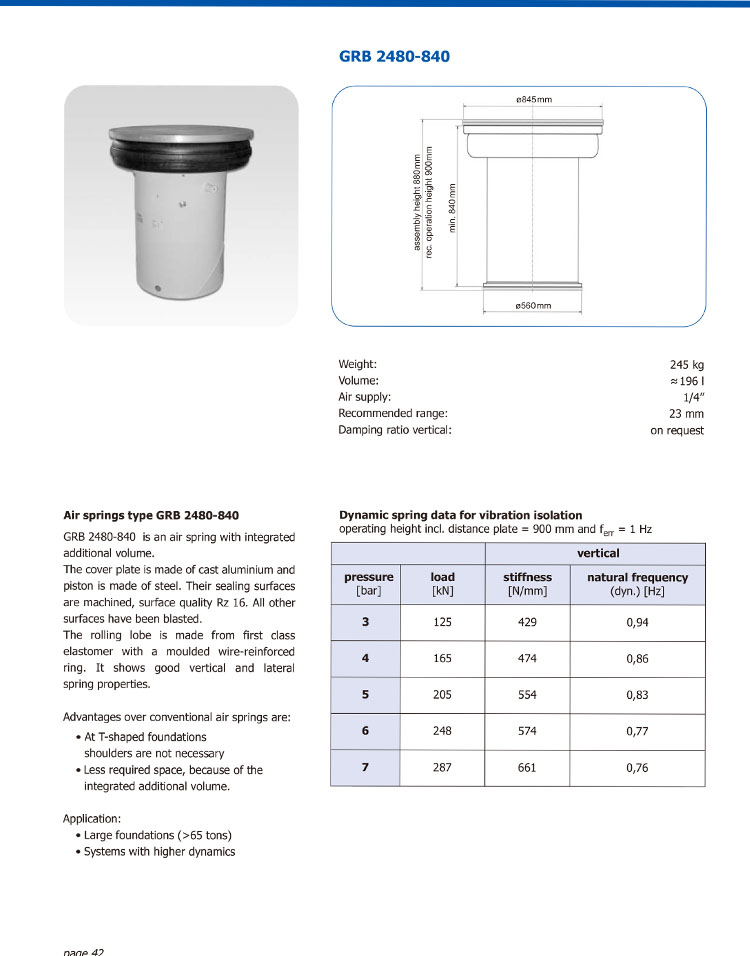 证了比其他空气弹簧型号更低的固有频率。结合可移动的附加空气容器 ,可实现低于1赫兹的固有频率。这种功能原理也实现了高度弹性位移。因此,特别是应用于高动态力设备和试验台系统的大范围振动频率,这种型号的设计几乎是完美的解决方案。另外,在被动隔振功能方面(如电子扫描显微镜),GRB空气弹簧同样效果显著。